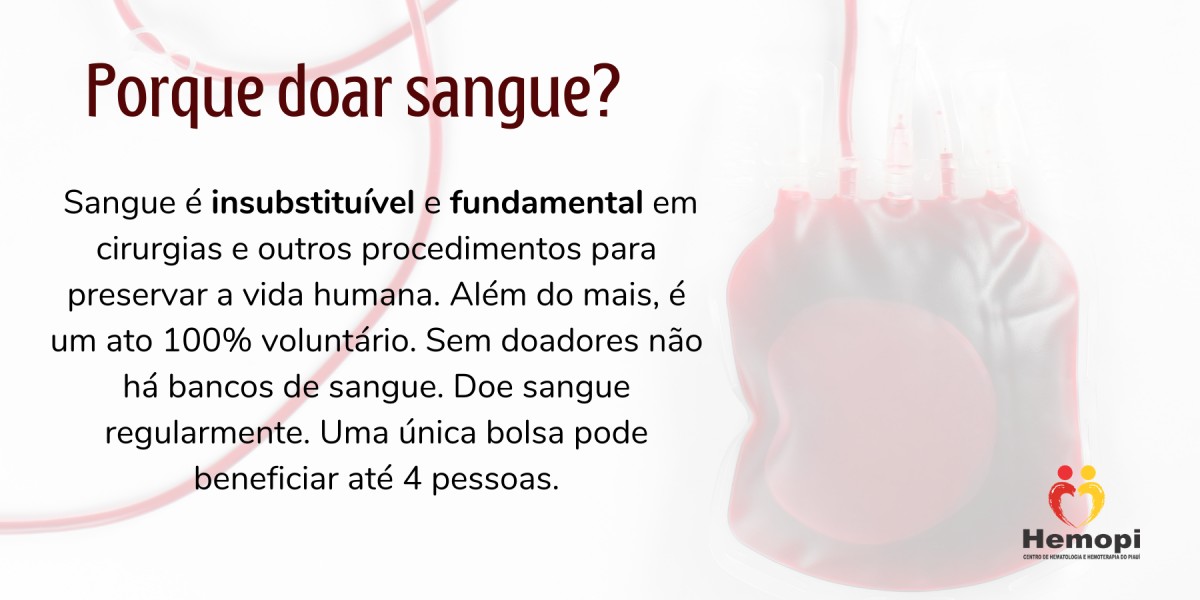 Sangue é insubstituível e fundamental em cirurgias e outros procedimentos para preservar a vida humana. Além do mais, é um ato 100% voluntário. Sem doadores não há bancos de sangue. Doe sangue regularmente. Uma única bolsa pode beneficiar até 4 pessoas.